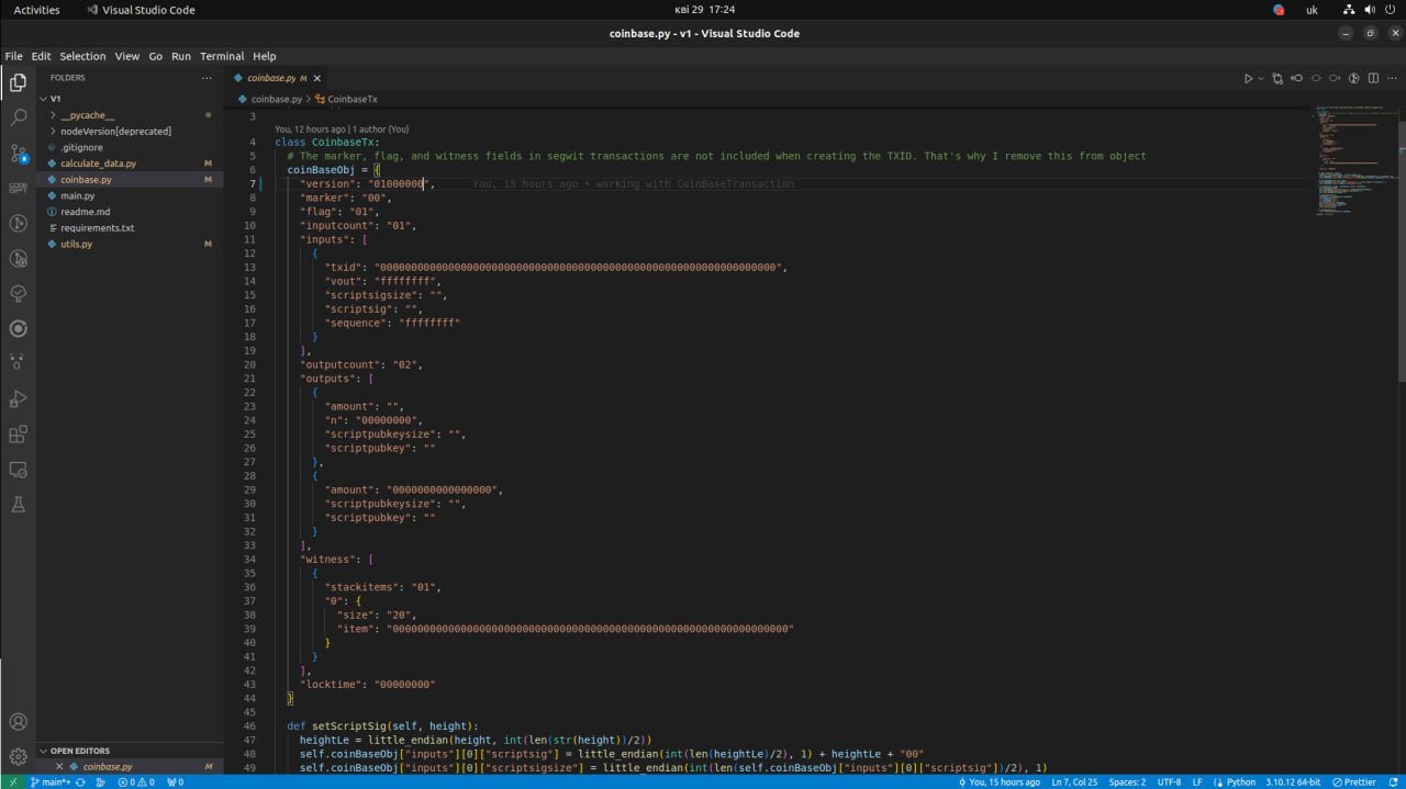 I do know that on this discussion board lots of questions on this subject, I’ve checked most of those, however cannot discover the answer for my job. I’m creating my very own algorithm for solo mining bitcoin on Python. I wrote all needed strategies for that, together with hashing the Merkle root, calculating the block header and many others. However now, I’m caught for a couple of weeks on the coinbase transaction. I’ve studied the coinbase transaction web page on LearnMeABitcoin.com and tried to implement all logic for it, however cannot totally perceive learn how to make one. I wish to embody new guidelines (BIP34 – block header, BIP141 – SegWit tx) on this algorithm, however my information about hashing this isn’t sufficient. 🙁