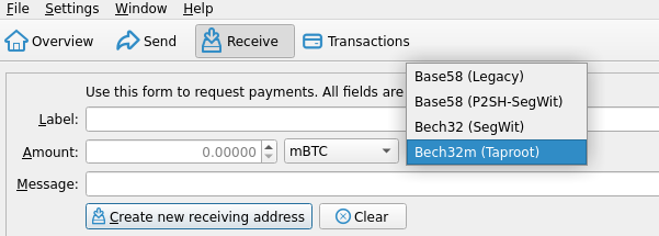 - Bech32m (Taproot).